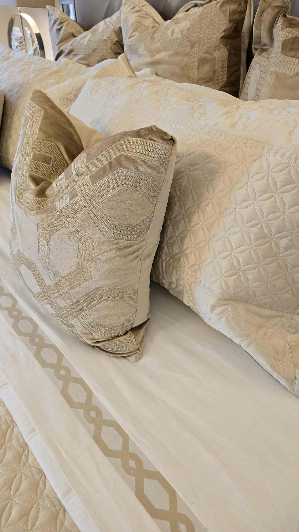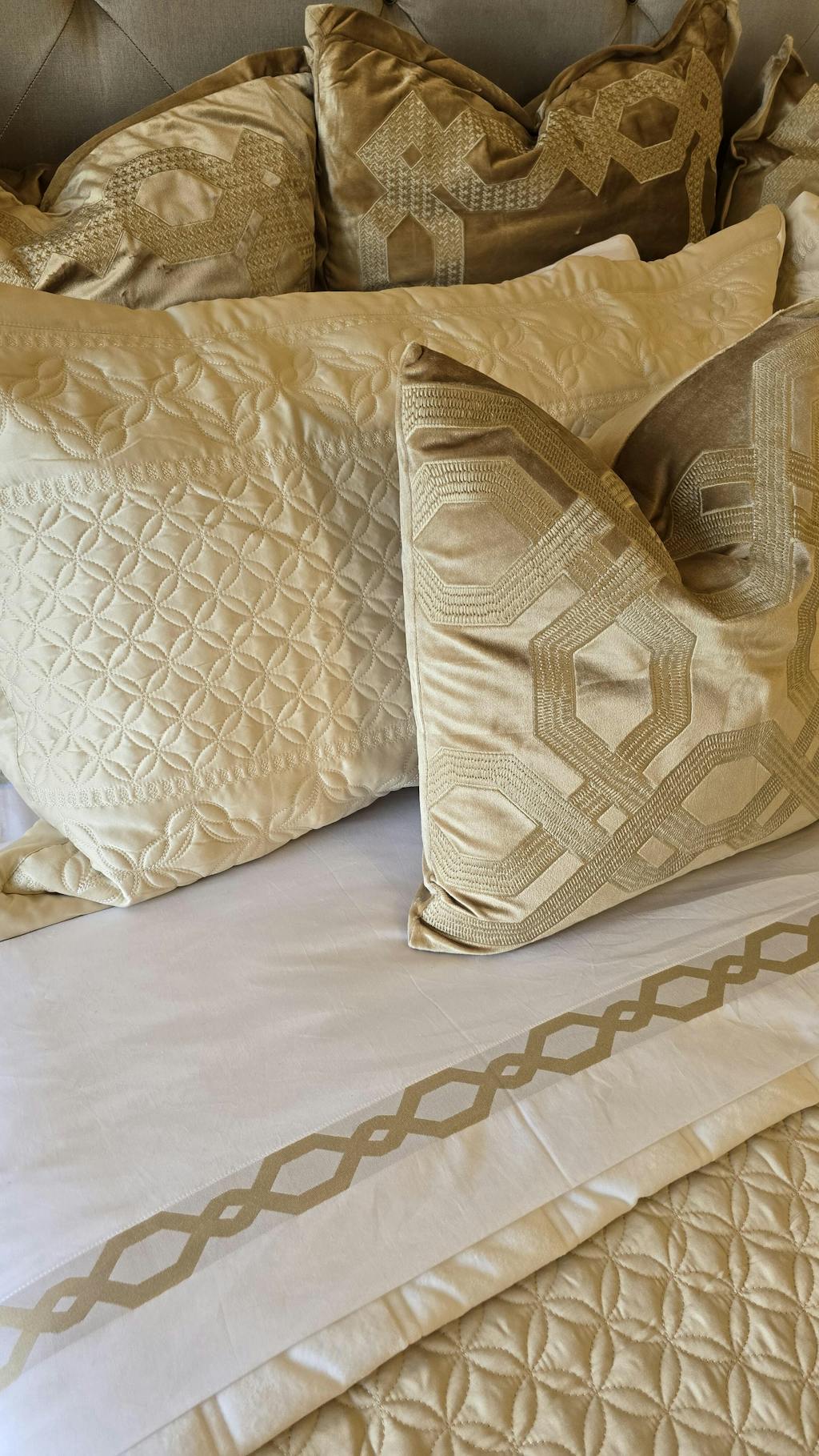 This decorative frame element is derived from geometric shapes and embroidered with metallic yarn using bold stitching lines. The luxurious velvet presents layered and varied color tones from different angles. It is soft to the touch and enjoyable to the eyes.