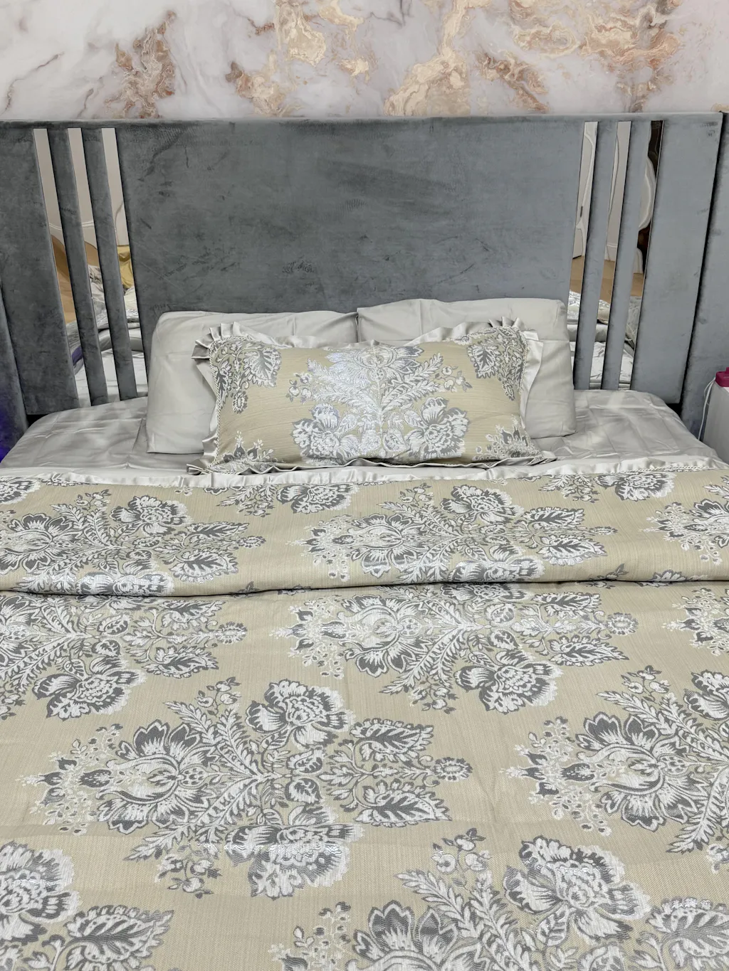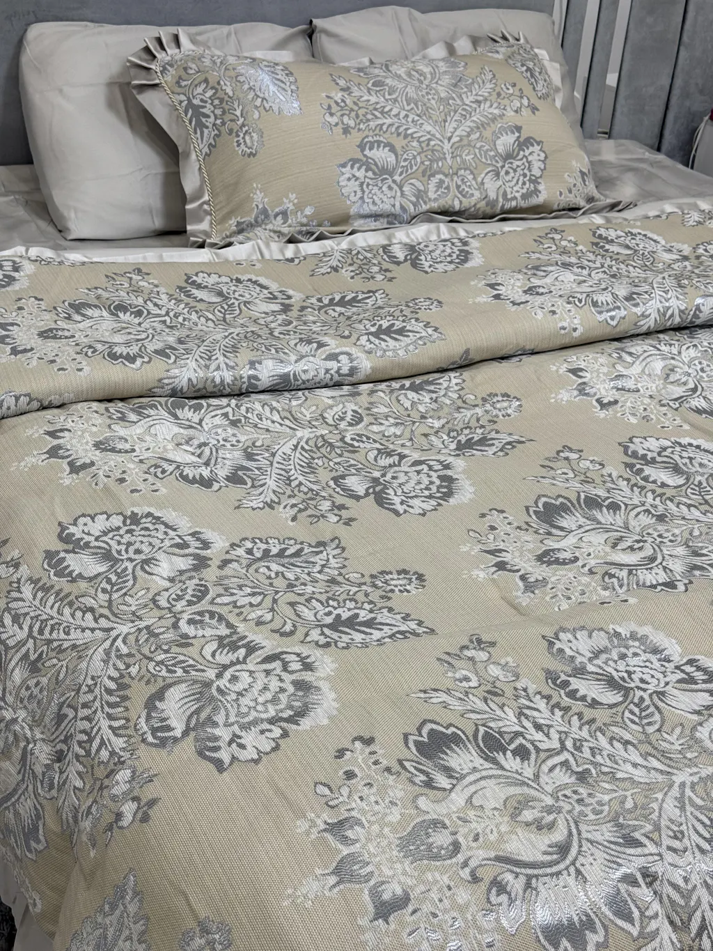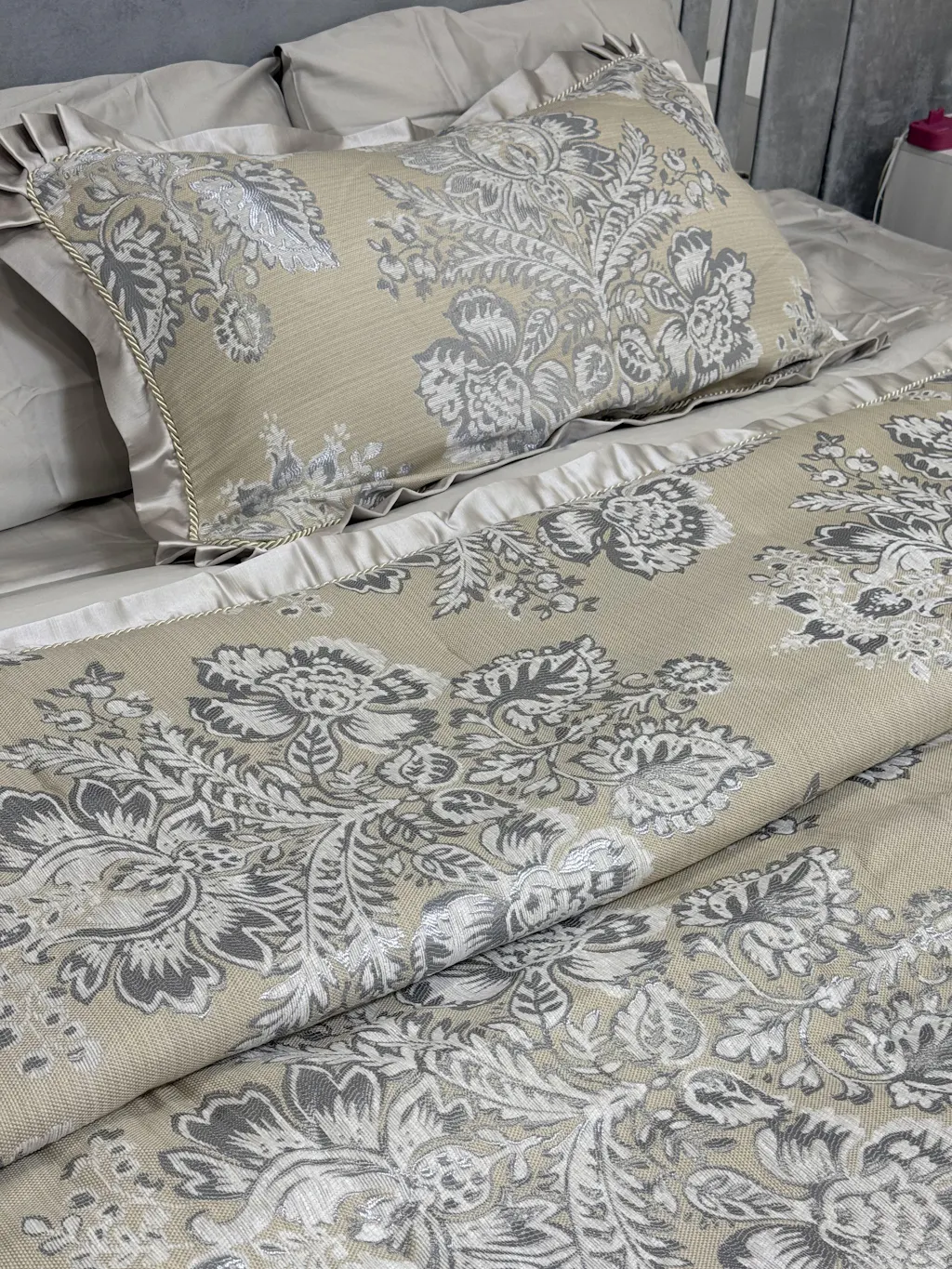 Inspired by the maximalist patterning and decor of the 21th century French royalty, the Julius comforter set is a true statement piece. An artful blend of soft chenille yarns mimic a vivid illusion of gold and add dimensions of luxury to the jacquard. The jewelry and painting inspired pattern exudes a regal color palette.