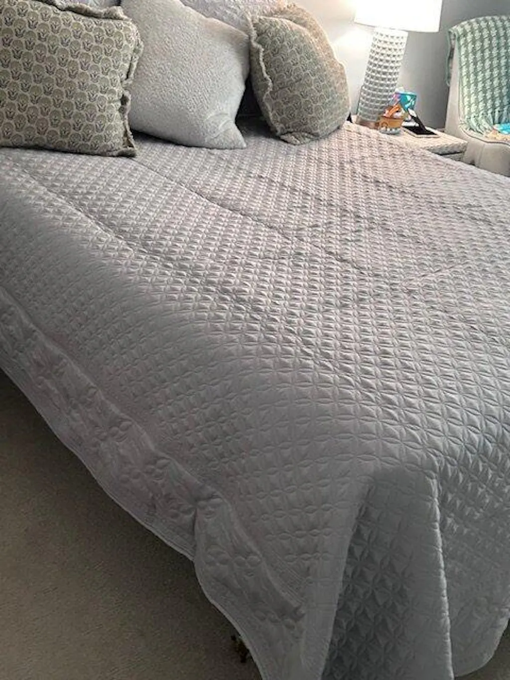 - Ornamental motif miters 3 coverlet sides and 2 shams with an all-over embroidered motif for the rest